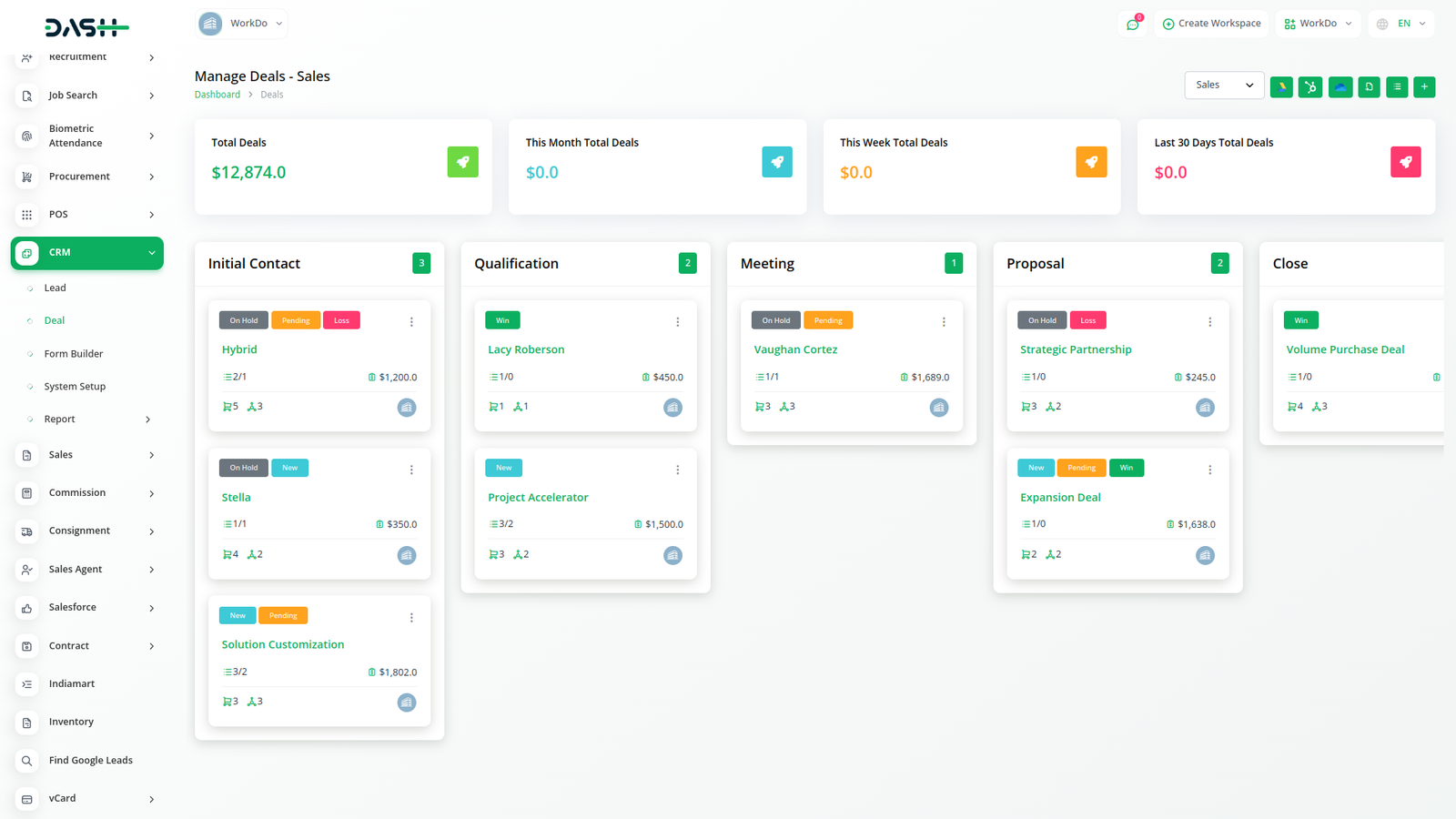 Manage deals with an easy drag-and-drop system. Easily relocate the deals to various stages through the Kanban board system.